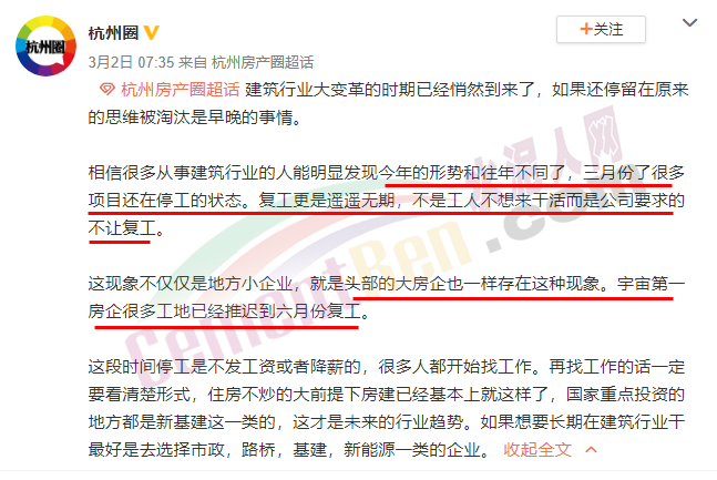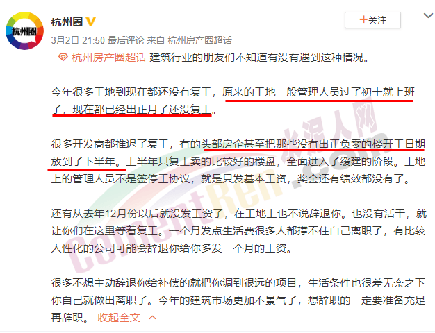 近期,有網友在社交媒體杭州房產圈超話欄目發(fā)起關于建筑行業(yè)的討論稱,很多工地到現在都還沒有復工,原來的工地一般管理人員過了初十就上班了,現在都已經出正月了還沒復工。