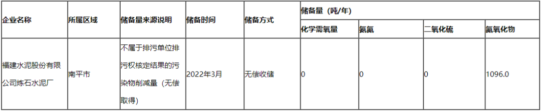 3月8日,福建省南平市生態(tài)環(huán)境局發(fā)布《南平市環(huán)境影響評價與排污權(quán)管理技術(shù)中心關(guān)于福建水泥股份有限公司煉石水泥廠排污權(quán)收儲情況的公示》稱,根據(jù)相關(guān)規(guī)定,現(xiàn)將福建水泥股份有限公司煉石水泥廠已核定的過期的可交易排污權(quán)(有效期2015年6月1日至2020年5月31日)指標(biāo)予以收儲。具體《公示》如下: