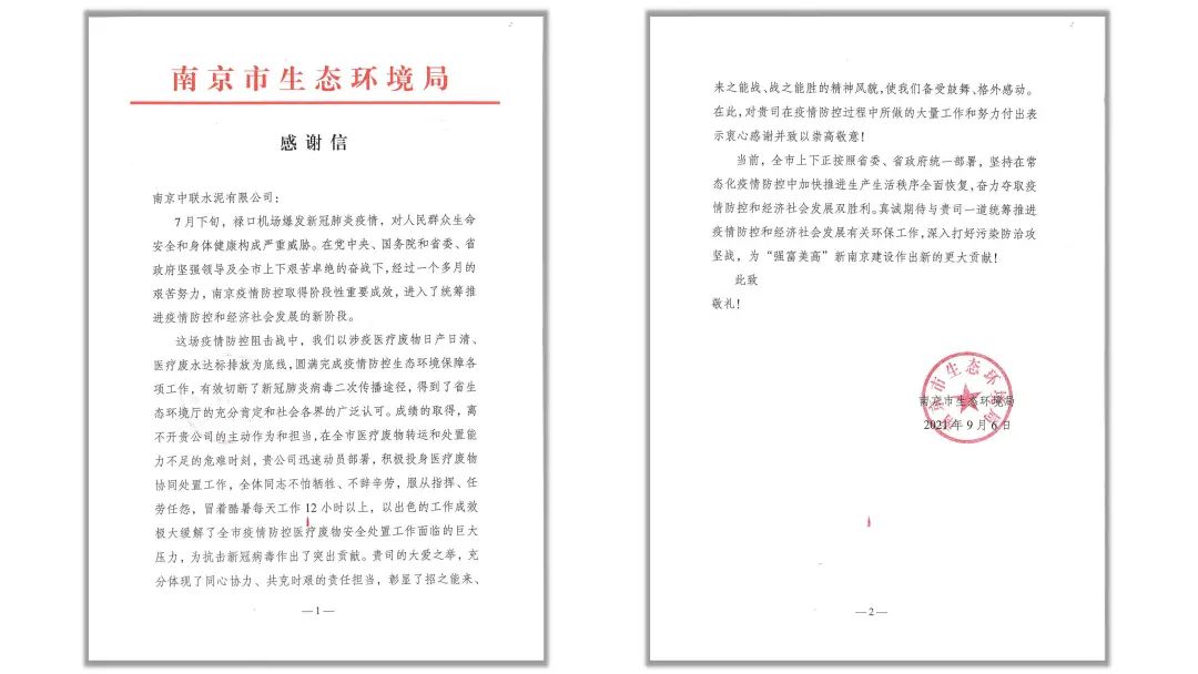 “貴司的大愛(ài)之舉,充分體現(xiàn)了同心協(xié)力、共克時(shí)艱的責(zé)任擔(dān)當(dāng),彰顯了招之能來(lái)、來(lái)之能戰(zhàn)、戰(zhàn)之能勝的精神風(fēng)貌,使我們備受鼓舞、格外感動(dòng)。在此,對(duì)貴司在疫情防控過(guò)程中所做的大量工作和努力付出表示衷心感謝并致以崇高敬意!”這是南京市生態(tài)環(huán)境局于2021年9月6日給予南京中聯(lián)水泥有限公司的一封感謝信。