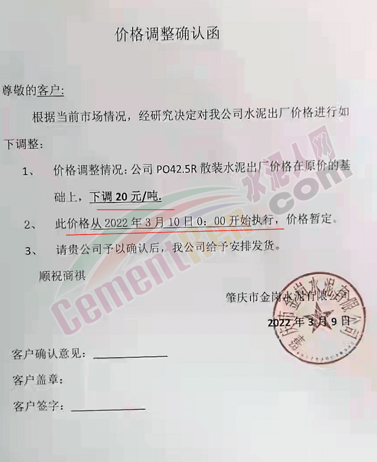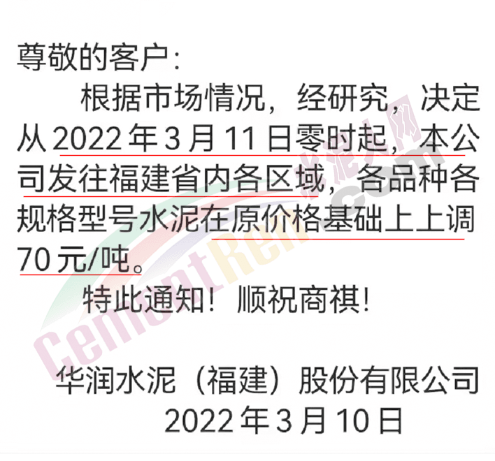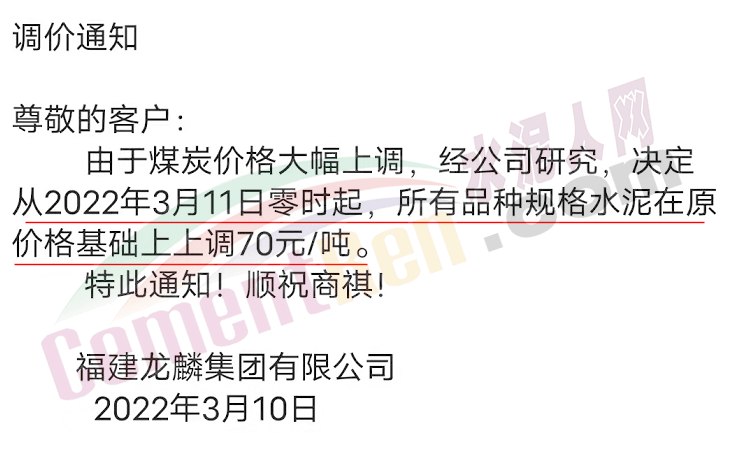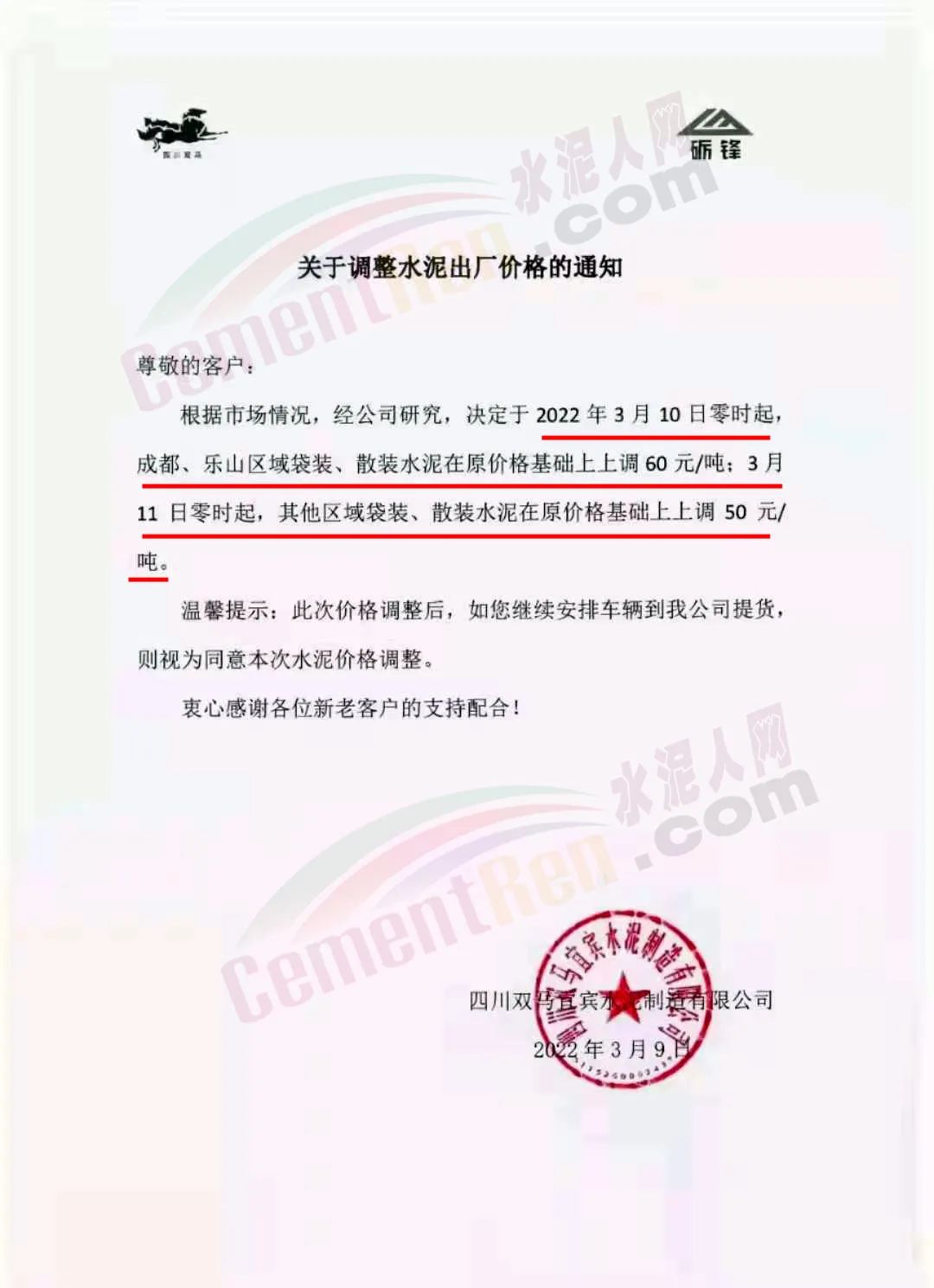 基于目前市場(chǎng)行情,結(jié)合我司實(shí)際情況,經(jīng)我公司研究決定,自2022年03月11日零時(shí)起,我公司發(fā)往全區(qū)域的各品牌、品種袋裝、散裝水泥、熟料的出廠價(jià)格,在原有基礎(chǔ)上上調(diào): 70元/噸。