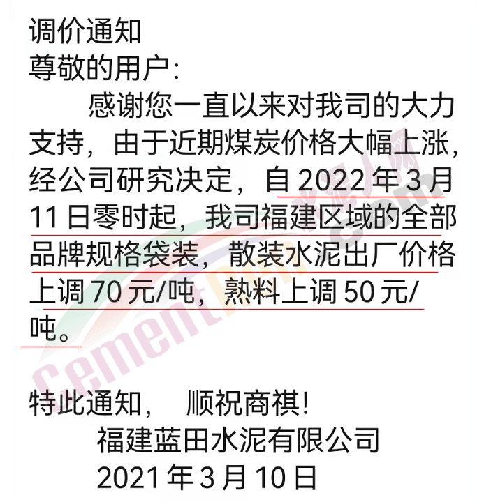 3月10日福建華潤(rùn)水泥、藍(lán)田水泥、永定閩福建材、永安謀成水泥、福建金牛水泥、龍麟集團(tuán)、鑫城水泥、大縣新巖、春馳新豐等水泥企業(yè)通知自11日起上調(diào)水泥價(jià)格70元/噸, 藍(lán)田水泥熟料同步上調(diào)50元/噸。
