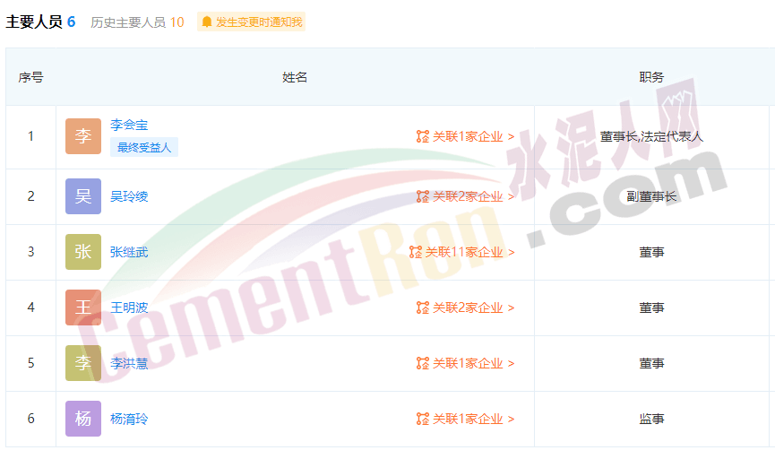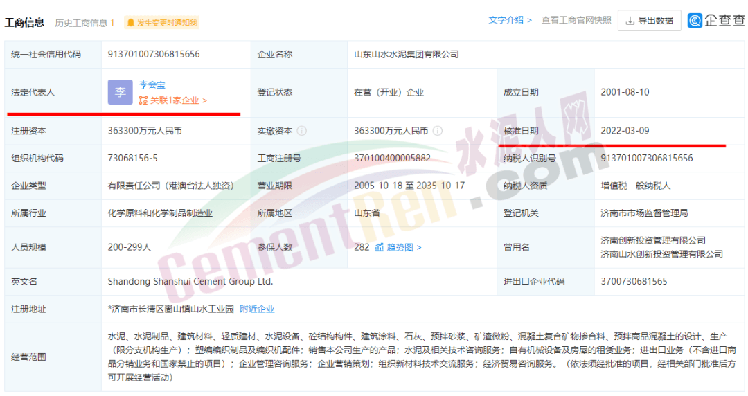 3月10日, 山東山水水泥集團有限公司(以下簡稱“山水水泥”)主要成員發(fā)生變更,法定代表人從常張利變更為李會寶。
