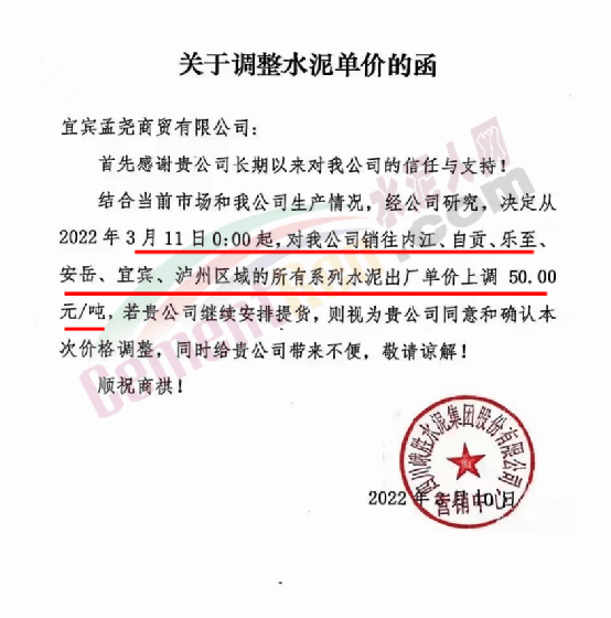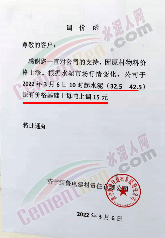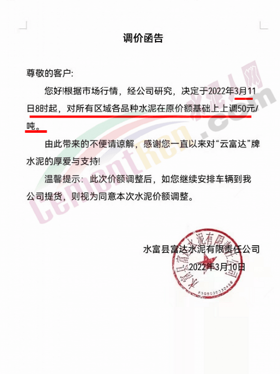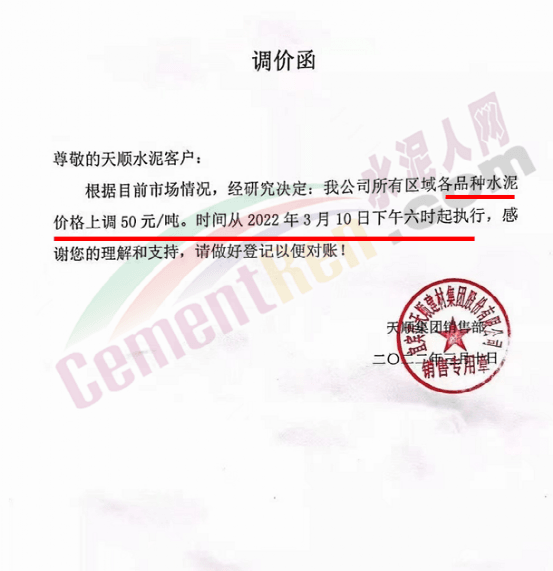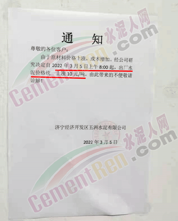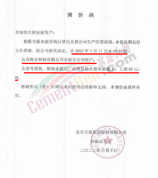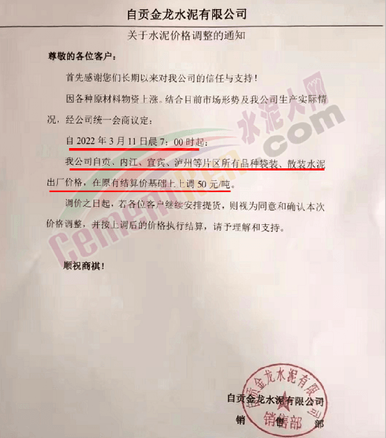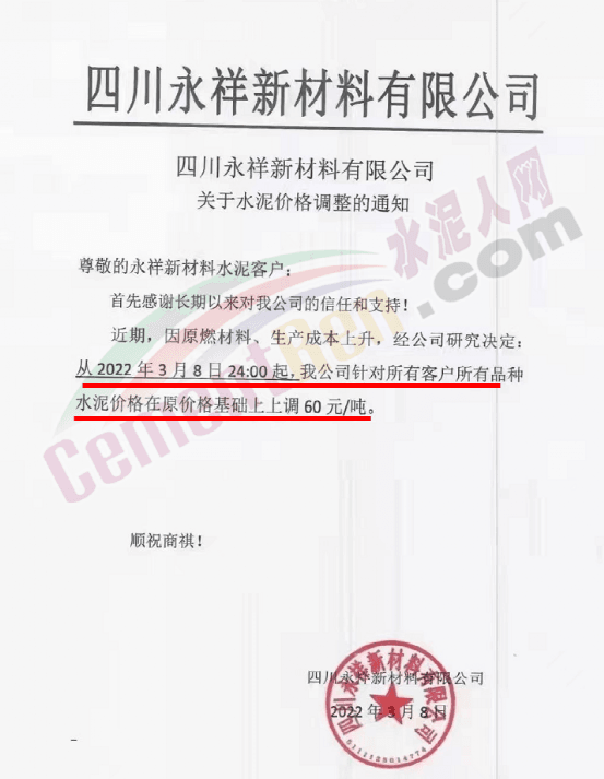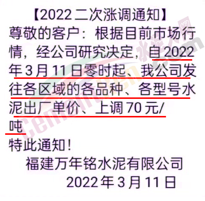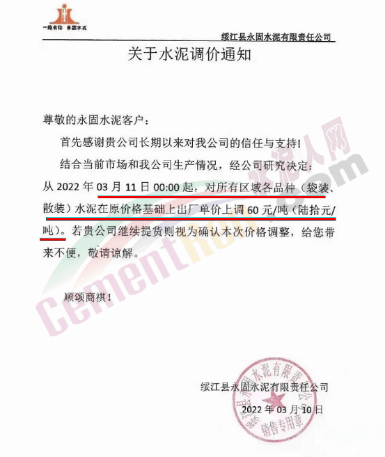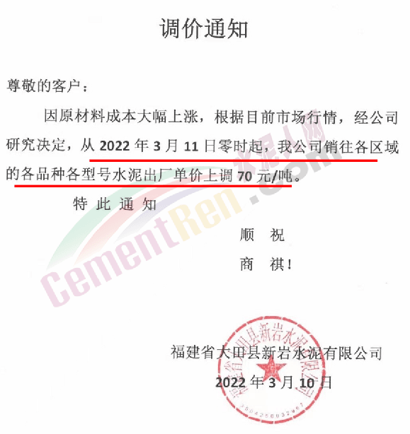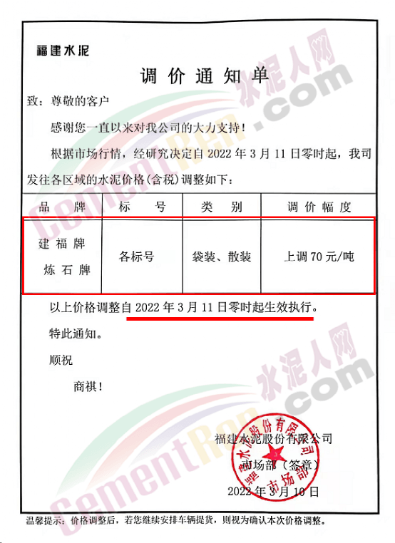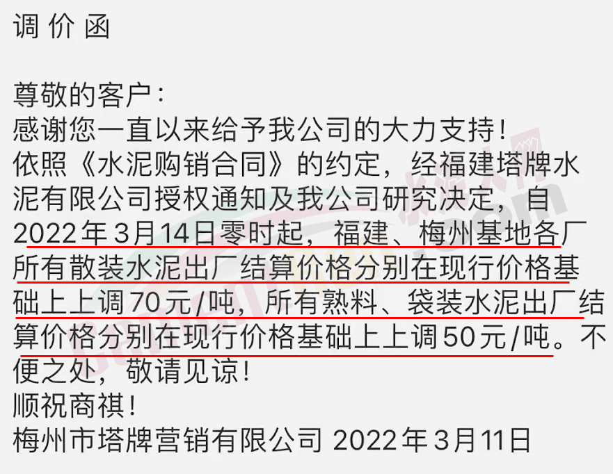 梅州市塔牌營銷有限公司通知,依照《水泥購銷合同》的約定,經(jīng)福建塔牌水泥有限公司授權(quán)通知及我公司研究決定,自2022年3月14日零時(shí)起,福建、梅州基地各廠所有散裝水泥出廠結(jié)算價(jià)格分別在現(xiàn)行價(jià)格基礎(chǔ)上上調(diào)70元/噸,所有熟料、袋裝水泥出廠結(jié)算價(jià)格分別在現(xiàn)行價(jià)格基礎(chǔ)上上調(diào)50元/噸。