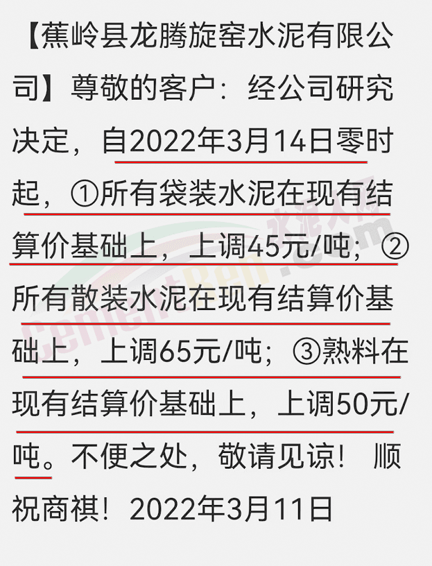 蕉嶺縣龍騰旋窯水泥有限公司通知自2022年3月14日零時(shí)起,所有袋裝水泥在現(xiàn)有結(jié)算價(jià)基礎(chǔ)上,上調(diào)45元/噸;所有散裝水泥在現(xiàn)有結(jié)算價(jià)基礎(chǔ)上,上調(diào)65元/噸;熟料在現(xiàn)有結(jié)算價(jià)基礎(chǔ)上,上調(diào)50元/噸。
