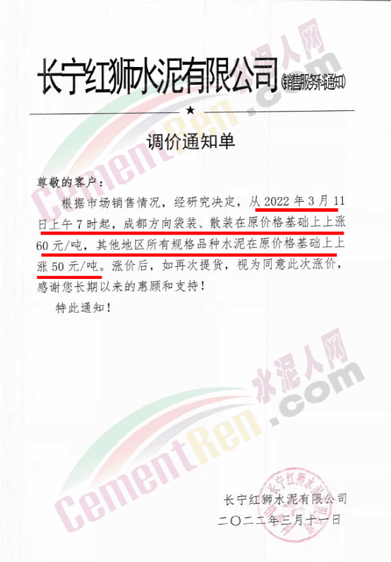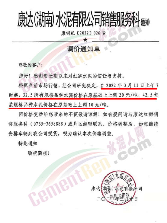 據(jù)水泥人網(wǎng)了解,春節(jié)后開工至今,湖南各區(qū)域水泥價(jià)格普遍呈上漲趨勢(shì)。紅獅水泥旗下康達(dá)(湖南)水泥有限公司銷售服務(wù)科通知,根據(jù)當(dāng)前市場行情,經(jīng)公司研究決定,自2022年3月11日上午7時(shí)起,32.5所有規(guī)格品種水泥價(jià)格在原基礎(chǔ)上上調(diào)20元/噸,42.5包裝規(guī)格品種水泥價(jià)格在原基礎(chǔ)上上調(diào)10元/噸。