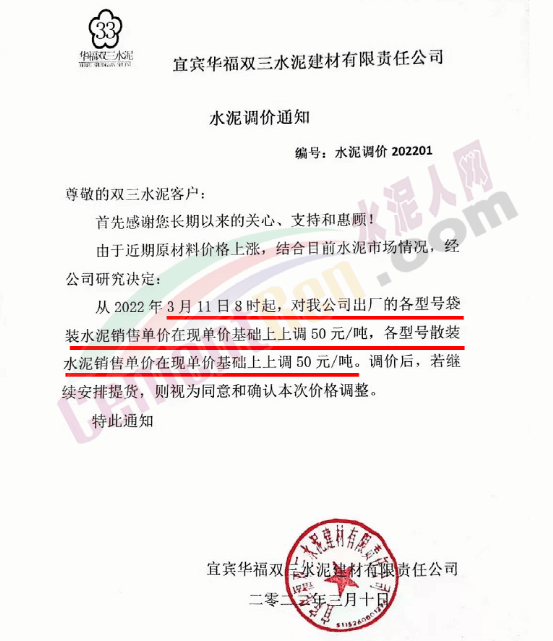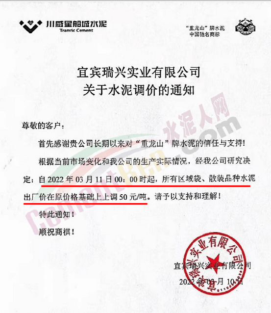 同日,梅州市紅日旋窯水泥有限公司通知自3月14日起各品種、各強(qiáng)度等級(jí)的袋裝水泥在原價(jià)基礎(chǔ)上上調(diào)50元/噸。
