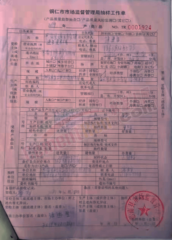 圖:銅仁市市場(chǎng)監(jiān)管管理局抽樣工作單