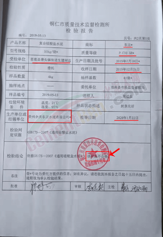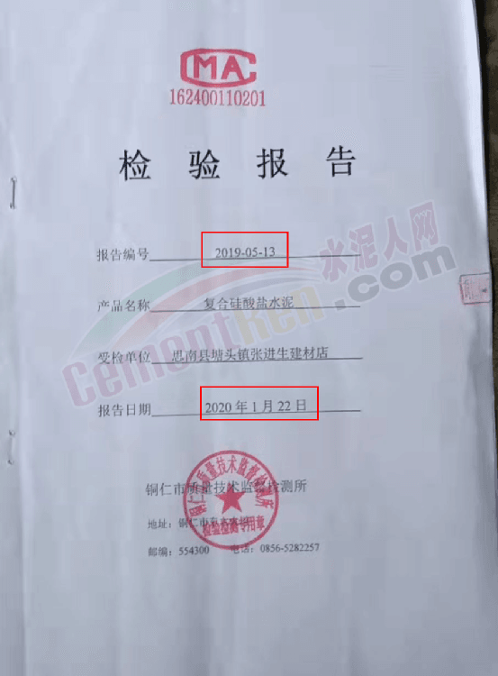 依據(jù)張進(jìn)生提供銅仁市質(zhì)量技術(shù)監(jiān)督檢測(cè)所2019-05-13檢驗(yàn)報(bào)告顯示,自思南縣塘頭鎮(zhèn)張進(jìn)生建材店抽樣的一個(gè)批次東立牌P.C32.5R復(fù)合硅酸鹽水泥不合格。產(chǎn)品生產(chǎn)經(jīng)單位為貴州余慶東立水泥有限公司。生產(chǎn)日期及批號(hào)為2019年7月10日,收樣日期為2019年12月24日 ,檢畢日期為2020年1月22日。