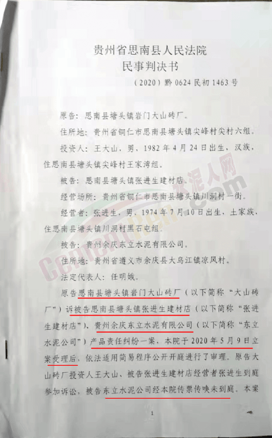 2020年3月27日把檢驗(yàn)報(bào)告及市場(chǎng)監(jiān)督管理取樣的經(jīng)過(guò)傳給了生產(chǎn)企業(yè)相關(guān)負(fù)責(zé)人。因遲遲未收到答復(fù),磚廠一紙?jiān)V狀將銷售者思南縣塘頭鎮(zhèn)張進(jìn)生建材店及東立水泥廠告上法庭。