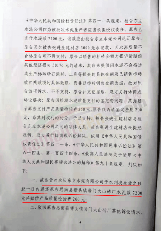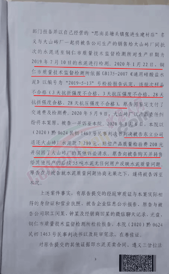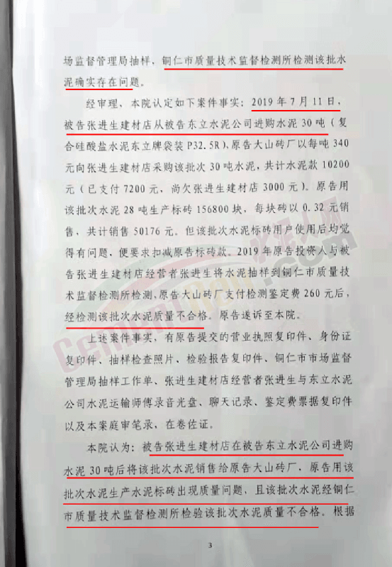 法院判決書(shū)提到,被告張進(jìn)生建材店在被告東立水泥公司進(jìn)購(gòu)水泥30噸后將該批次水泥銷售給原告大山磚廠,原告用該批次水泥生產(chǎn)水泥標(biāo)磚出現(xiàn)質(zhì)量問(wèn)題,且該批次水泥經(jīng)銅仁市質(zhì)量技術(shù)監(jiān)督檢測(cè)所檢驗(yàn)該批次水泥質(zhì)量不合格。
