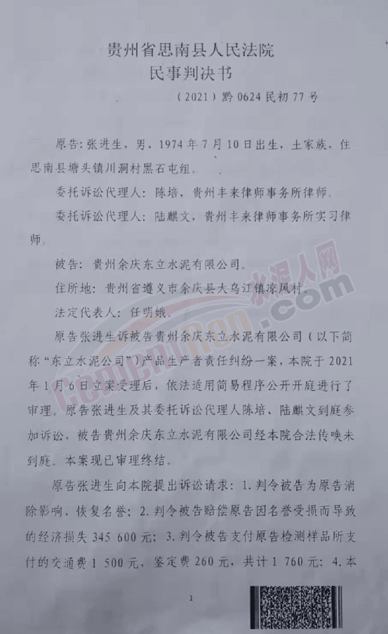 日前,水泥人網(wǎng)接到貴州省銅仁市思南縣塘頭鎮(zhèn)川硐村黑石屯組建材經(jīng)銷個(gè)體戶張進(jìn)生反饋稱,因銷售不合格水泥被客戶訴之法院,導(dǎo)致名譽(yù)受損,水泥銷售生意難以維系。