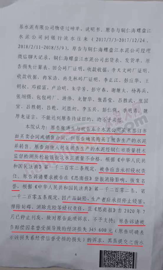 法院認(rèn)為,原告張進(jìn)生與被告東立水泥公司雖未簽訂書(shū)面買賣合同或銷售合同、但原告確實(shí)購(gòu)買了被告生產(chǎn)的水泥并轉(zhuǎn)售。原告向他人轉(zhuǎn)售被告生產(chǎn)的水泥經(jīng)銅仁市質(zhì)量技術(shù)監(jiān)督檢測(cè)所檢驗(yàn)該批次水泥質(zhì)量不合格,根據(jù)《中華人民共和國(guó)民法典》第一千二百零二條規(guī)定,被告應(yīng)當(dāng)承擔(dān)侵權(quán)責(zé)任。原告訴請(qǐng)要求被告在《思南報(bào)》登報(bào)消除影響、恢復(fù)名譽(yù)、根據(jù)《中華人民共和國(guó)民法典》第一千二百零二條、第一千二百零五條規(guī)定,因產(chǎn)品缺陷,生產(chǎn)者應(yīng)承擔(dān)停止侵害、排除妨礙、消除危險(xiǎn)等侵權(quán)責(zé)任且《思南報(bào)》自 2020年7 月已停止刊發(fā),故對(duì)原告此項(xiàng)訴求、不予支持;