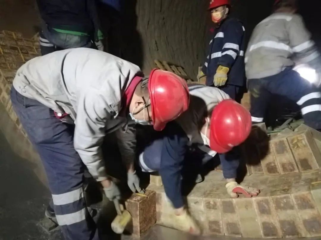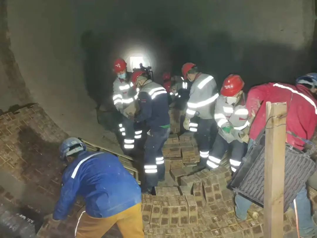 但在檢修后期,由于疫情的持續(xù)影響,造成外省筑爐施工人員始終無法到位,窯磚砌筑緩慢,嚴重影響到整體施工進度。但工期就是命令,為了保證按時點火生產(chǎn)。生產(chǎn)運行部門從部門負責人到車間主任到普通員工一起上陣與有限的筑爐人員協(xié)同配合,從清理廢舊窯磚、新磚砌筑、燃燒器精確定位到中控操作員組織協(xié)調(diào)精心操作,終于按時完成了砌筑工作。