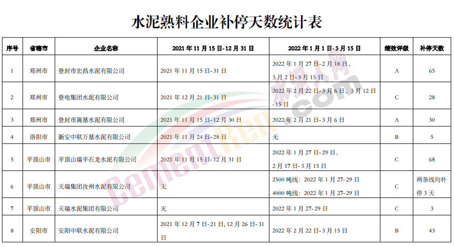 3月14日,河南省生態(tài)環(huán)境廳發(fā)布《關(guān)于補(bǔ)齊水泥熟料企業(yè)錯(cuò)峰停產(chǎn)時(shí)間的通知》稱全省水泥熟料企業(yè)于2022年3月16日陸續(xù)恢復(fù)生產(chǎn)。但是,污染源在線監(jiān)控?cái)?shù)據(jù)顯示,全省有17家水泥熟料企業(yè)因承擔(dān)處置任務(wù)等原因未實(shí)施錯(cuò)峰生產(chǎn),需按實(shí)際生產(chǎn)天數(shù)補(bǔ)齊停產(chǎn)天數(shù)。