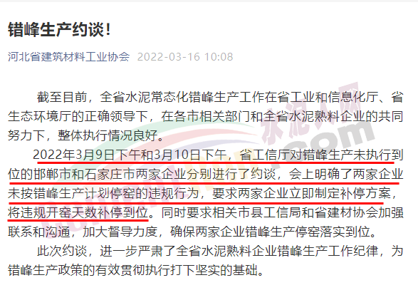同期,河北省建筑材料工業(yè)協(xié)會(huì)發(fā)消息稱,2022年3月9日下午和3月10日下午,河北省工信廳對(duì)錯(cuò)峰生產(chǎn)未執(zhí)行到位的邯鄲市和石家莊市兩家企業(yè)分別進(jìn)行了約談,會(huì)上明確了兩家企業(yè)未按錯(cuò)峰生產(chǎn)計(jì)劃停窯的違規(guī)行為,要求兩家企業(yè)立即制定補(bǔ)停方案,將違規(guī)開(kāi)窯天數(shù)補(bǔ)停到位。同時(shí)要求相關(guān)市縣工信局和省建材協(xié)會(huì)加強(qiáng)聯(lián)系和溝通,加大督導(dǎo)力度,確保兩家企業(yè)錯(cuò)峰生產(chǎn)停窯落實(shí)到位。