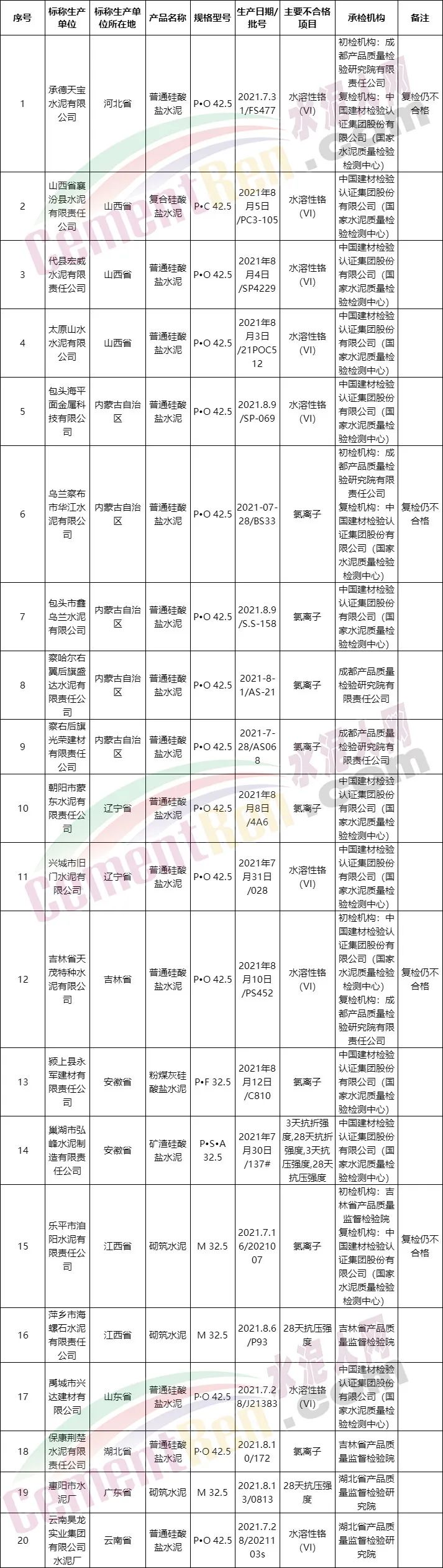 21家企業(yè)中承德天寶水泥有限公司、烏蘭察布市華江水泥有限公司、吉林省天茂特種水泥有限公司、樂平市洎陽(yáng)水泥有限責(zé)任公司4家企業(yè)復(fù)檢仍不合格。