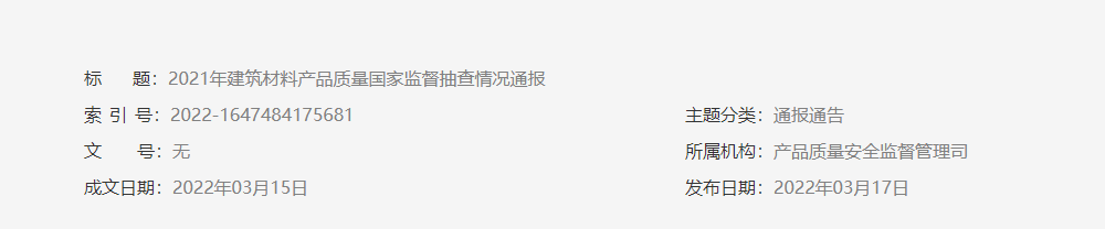 3月17日,國(guó)家市場(chǎng)監(jiān)督管理總局發(fā)布《2021年建筑材料產(chǎn)品質(zhì)量國(guó)家監(jiān)督抽查情況通報(bào)》稱,2021年,市場(chǎng)監(jiān)管總局組織開展了建筑材料產(chǎn)品質(zhì)量國(guó)家監(jiān)督抽查。本次抽查了1395家企業(yè)生產(chǎn)的1415批次產(chǎn)品,涉及鋁合金建筑型材、熱軋帶肋鋼筋、建筑防水卷材、水泥等4種建筑材料產(chǎn)品,共發(fā)現(xiàn)110批次產(chǎn)品不合格,抽查不合格率為7.8%。