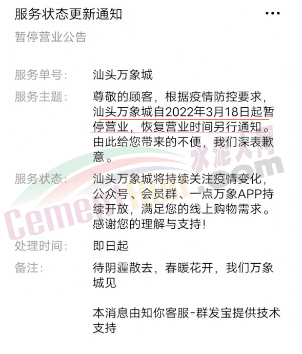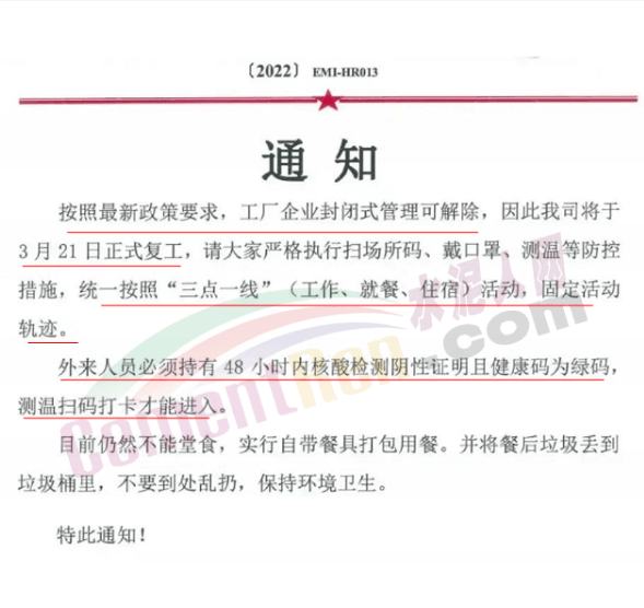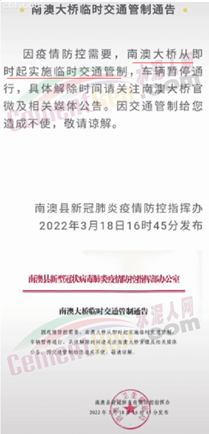 廣東深圳疫情防控指揮部發(fā)布通告稱,3月14日至20日,非城市保障型企業(yè)停止運營或居家辦公,停止一切非必要流動、活動,全市全員進行三輪核酸檢測。廣東東莞全面升級防控措施,發(fā)生本土疫情的鎮(zhèn)街(園區(qū)),所有企業(yè)一律停止生產活動;未發(fā)生本土疫情的,實行封閉式管理的產業(yè)園區(qū),在嚴格落實各項防疫措施的前提下維持基本生產。深莞兩市,除保障城市運行及供港物資貨運的交通外,全市公交、地鐵停運。根據通告指示,許多倉儲物流企業(yè)暫停運營。深圳市金運達國際物流表示,自2022年3月14日起,深圳所有倉點暫停辦理進出倉業(yè)務;城市國際物流發(fā)布通知稱,東莞集運倉庫自2022年3月16日起,工廠停產停工,在此期間,倉庫暫停收貨、裝箱發(fā)貨。汕頭萬象城通知暫停營業(yè),恢復營業(yè)時間另行通知。南澳大橋臨時交通管制……