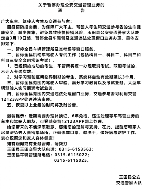 尉氏縣所有省際班線、市際班線、尉氏縣至鄭州線路車輛(鄭州至尉氏縣線路車輛)、市內班線(尉氏至開封、尉氏至通許)和縣內班線、全縣所有公交車輛、出租(巡游)車輛暫時停運,恢復時間另行通知。
