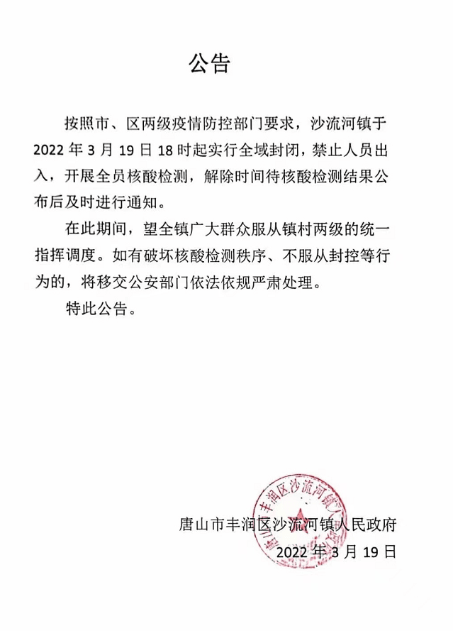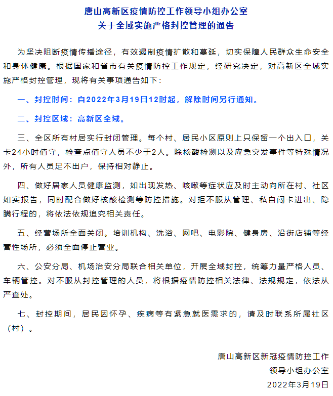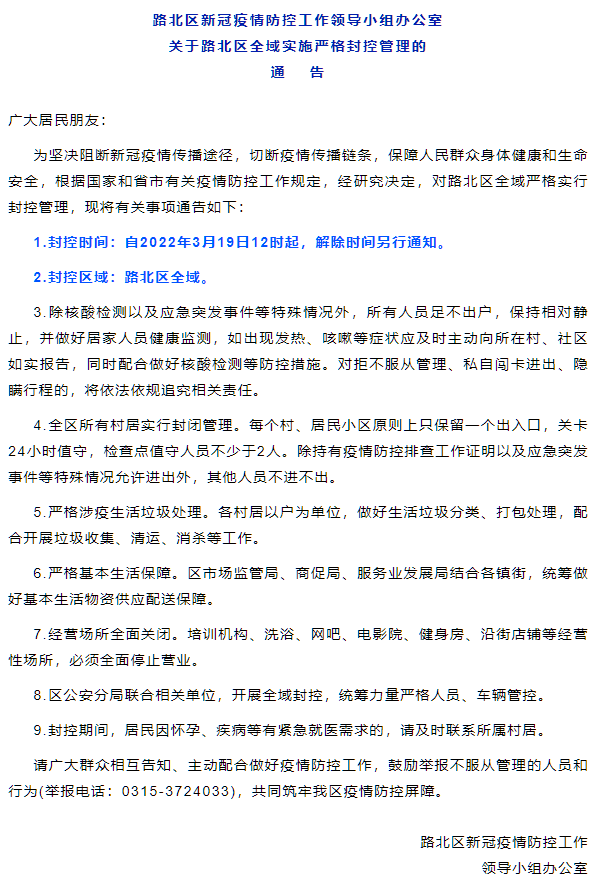 水泥重鎮(zhèn)唐山市多個區(qū)縣通知全域實施嚴格封控管理。
