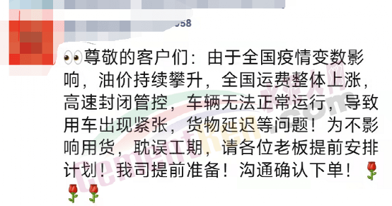 物流司機則表示,疫情封控區(qū)、管控區(qū)、防范區(qū)層層設卡,要繞行勢必提高運輸成本,再加上近期油價飆升,最近一周運輸成本上漲了30%,去蘇南送一趟貨就要賠上千元。