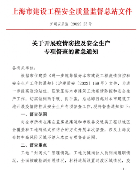 根據(jù)市住建委發(fā)布《進(jìn)一步統(tǒng)籌做好本市建設(shè)工程疫情防控和安全生產(chǎn)工作的通知》(滬建質(zhì)安〔2022〕169號)文件稱,總站即日起對本市建筑工地開展疫情防控及安全生產(chǎn)專項(xiàng)督查工作。