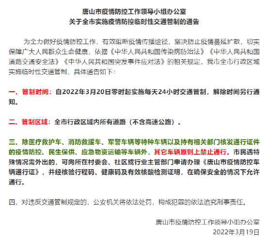 同日,唐山市新冠肺火防控工作領(lǐng)導(dǎo)小組辦公室發(fā)布加強(qiáng)全市重點(diǎn)場所管控的通告,對全市實(shí)施疫情防控臨時(shí)性交通管制。