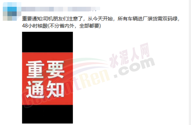 有網(wǎng)友發(fā)消息稱,因當(dāng)?shù)啬晨h出現(xiàn)疫情,距離水泥廠熟料基地幾十公里,但仍要求對廠區(qū)進(jìn)行封閉管控,禁止人員流動(dòng),不許進(jìn)出。