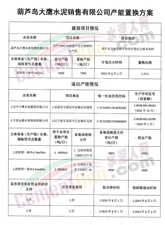 3月22日,遼寧省工信廳發(fā)布《關(guān)于葫蘆島大鷹水泥銷售有限公司5500噸/日水泥熟料生產(chǎn)線產(chǎn)能置換的通告》,葫蘆島大鷹水泥銷售公司將通過退出遼寧大鷹水水泥集團(tuán)和大連永盛水泥制造有限公司4000t/d和3000t/d兩條熟料生產(chǎn)線,用于新建一條5500t/d水泥熟料生產(chǎn)線。并計(jì)劃于2023年8月1日點(diǎn)火投產(chǎn),置換比例1.27:1。