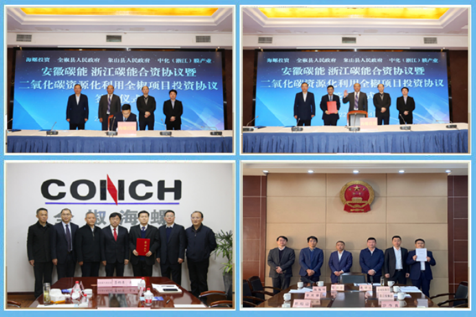 2022年3月24日上午,海螺投資公司與全椒縣政府、象山縣政府、中化膜產(chǎn)業(yè)公司通過(guò)云簽約形式,正式簽署安徽碳能、浙江碳能合資協(xié)議以及二氧化碳資源化利用全椒項(xiàng)目投資協(xié)議。全椒縣、象山縣主要領(lǐng)導(dǎo)及相關(guān)部門負(fù)責(zé)同志,中化膜產(chǎn)業(yè)公司總經(jīng)理周海明,海螺集團(tuán)黨委委員、總經(jīng)濟(jì)師、海螺投資總經(jīng)理丁鋒,海螺投資總經(jīng)理助理程竹松、海螺集團(tuán)戰(zhàn)略企劃部副部長(zhǎng)盧叔敏等出席儀式并見證簽約。