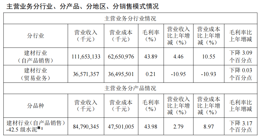 水泥熟料自產(chǎn)品銷量為3.04億噸,同比下降6.53%;自產(chǎn)品銷售收入1,116.53億元,同比增長4.46%;自產(chǎn)品銷售成本626.51億元,同比上升10.55%;自產(chǎn)品綜合毛利率為43.89%,較上年同期下降3.09個(gè)百分點(diǎn)。