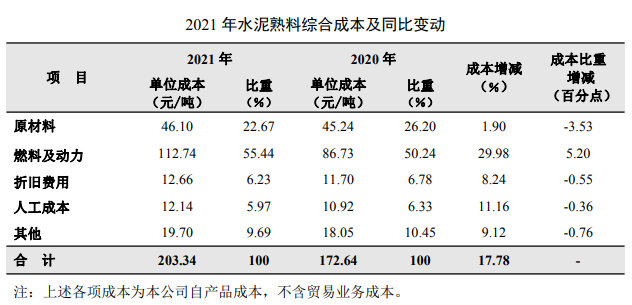 報(bào)告期內(nèi),受原煤價(jià)格大幅上漲影響,公司水泥熟料綜合成本同比上升 17.78%。