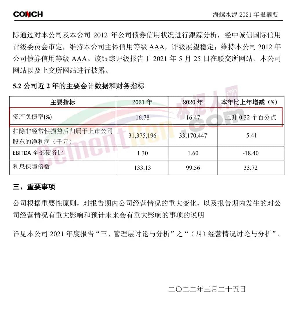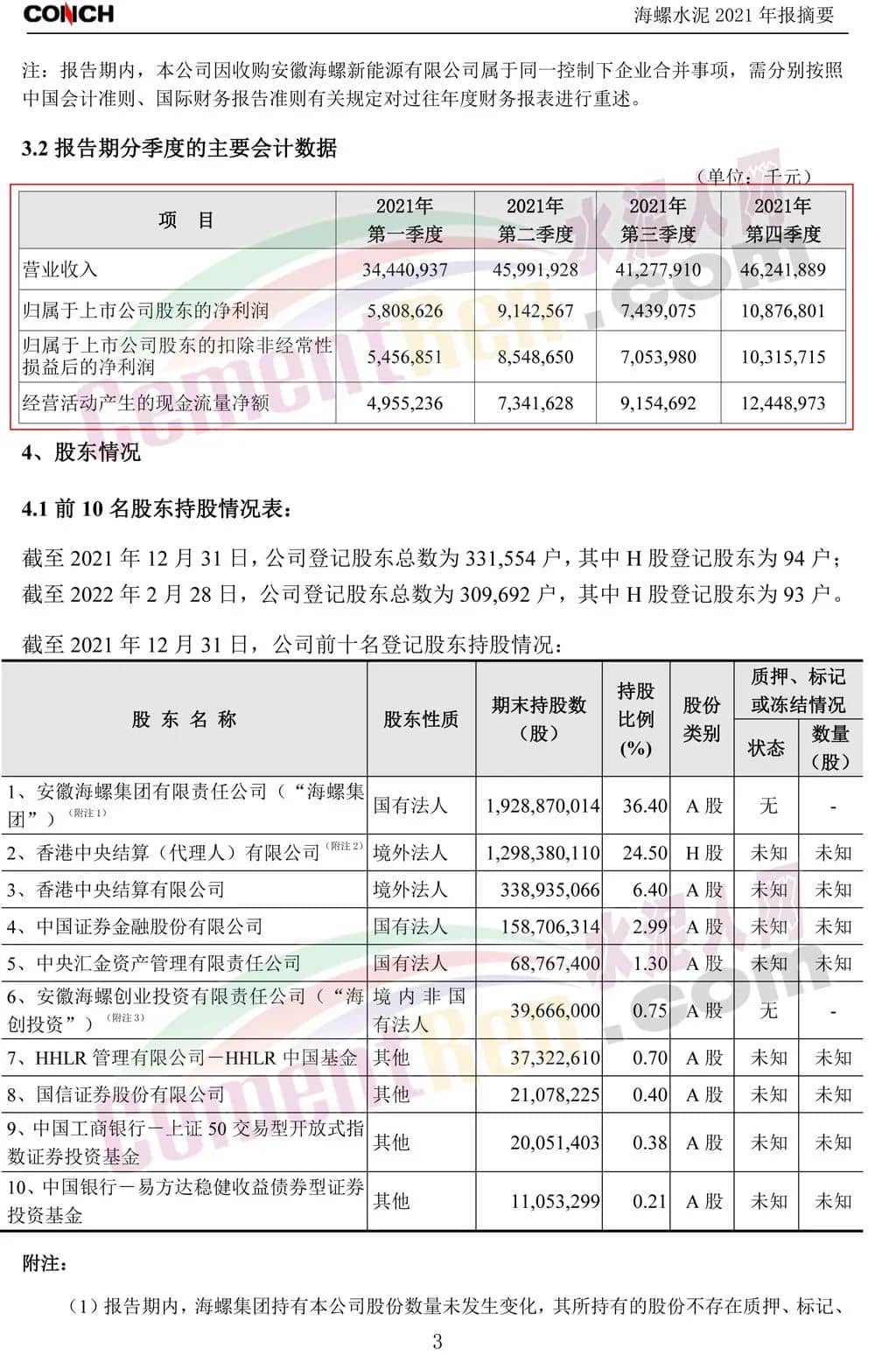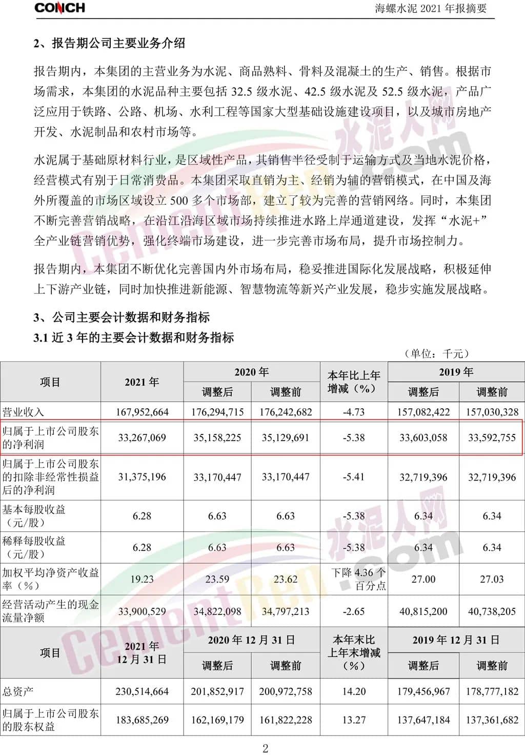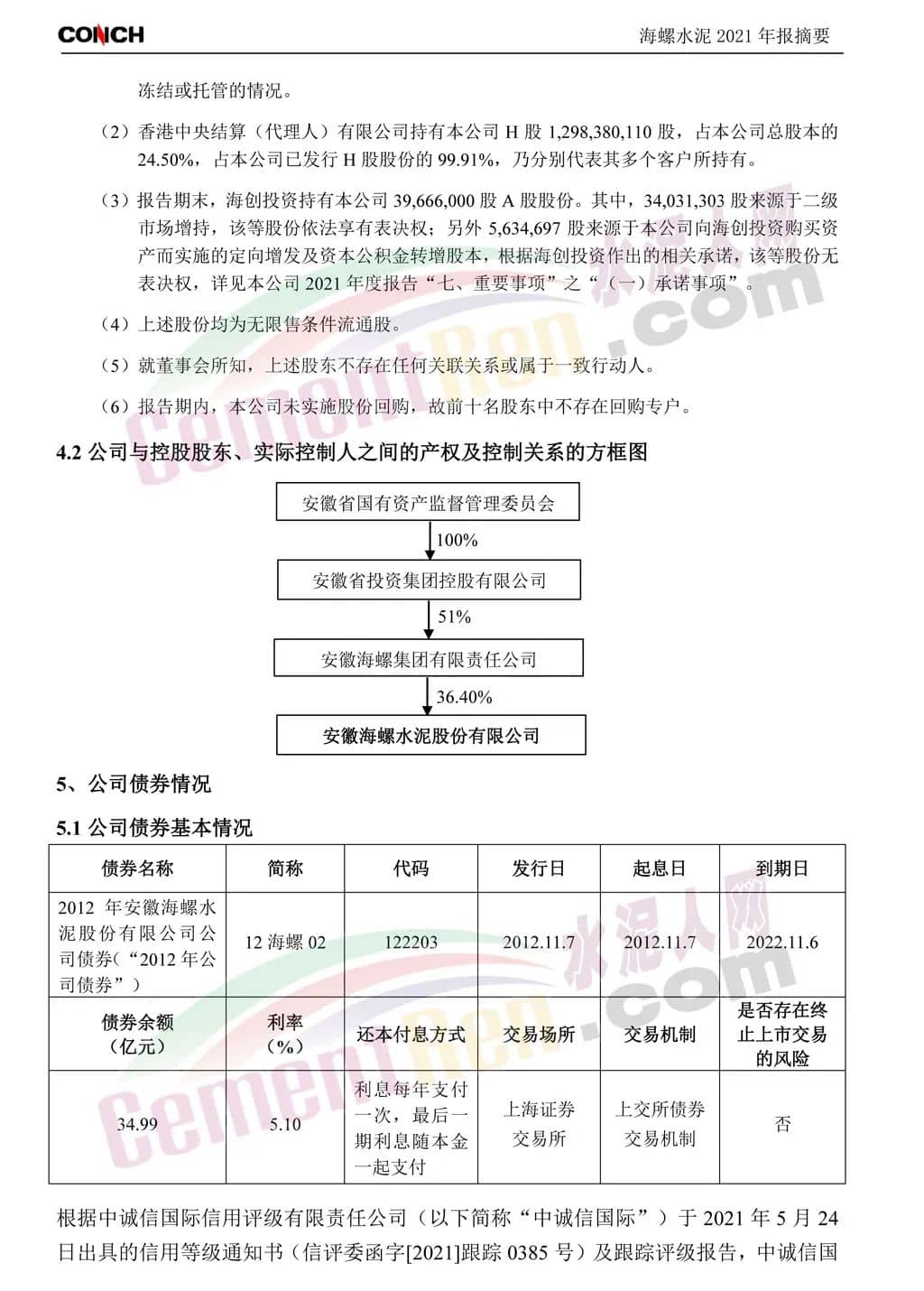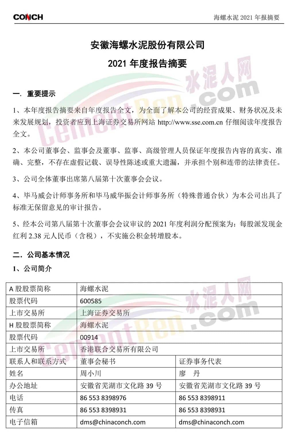 附安徽海螺水泥有限公司2021年度報(bào)告摘要