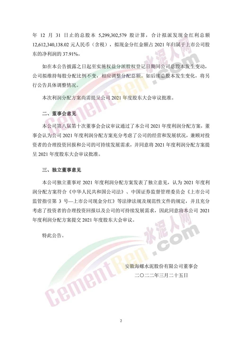 附安徽海螺水泥股份有限公司2021年年度利潤分配方案公告