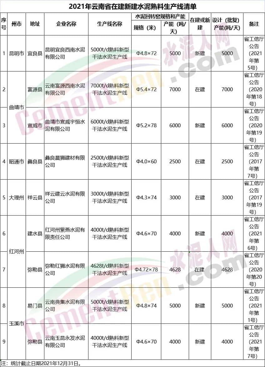 近期,寧夏、內(nèi)蒙、新疆、江蘇、浙江、山東、安徽 、云南、四川、河南、吉林、廣西、甘肅、陜西、天津、河北、貴州、黑龍江等18個(gè)省市自治區(qū)分別發(fā)布了截止2021年12月31日的水泥熟料生產(chǎn)線清單。部分省份公布的清單中不僅明確生產(chǎn)線設(shè)計(jì)產(chǎn)能、實(shí)際產(chǎn)能、窯規(guī)格尺寸以及建成投產(chǎn)時(shí)間。還有部分省市還將產(chǎn)能置換項(xiàng)目以及新建、在建項(xiàng)目也都明確標(biāo)注出來了。