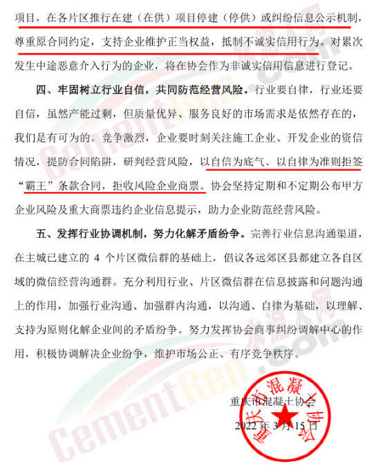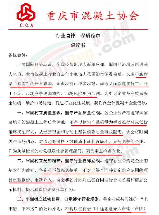 重慶市混凝土協(xié)會發(fā)布行業(yè)自律、保質(zhì)穩(wěn)市倡議書稱,目前國際形勢動蕩,全國疫情出現(xiàn)大面積反彈,國內(nèi)經(jīng)濟(jì)增速再遇強(qiáng)大阻力。重慶市混凝土行業(yè)自去年出現(xiàn)較大范圍的市場震蕩后,又遭年底商票“爆雷”的嚴(yán)重影響,企業(yè)經(jīng)營已舉步維艱,如今又面臨建筑復(fù)工、開工不足,市場競爭更加激烈,市場風(fēng)險更為加劇。