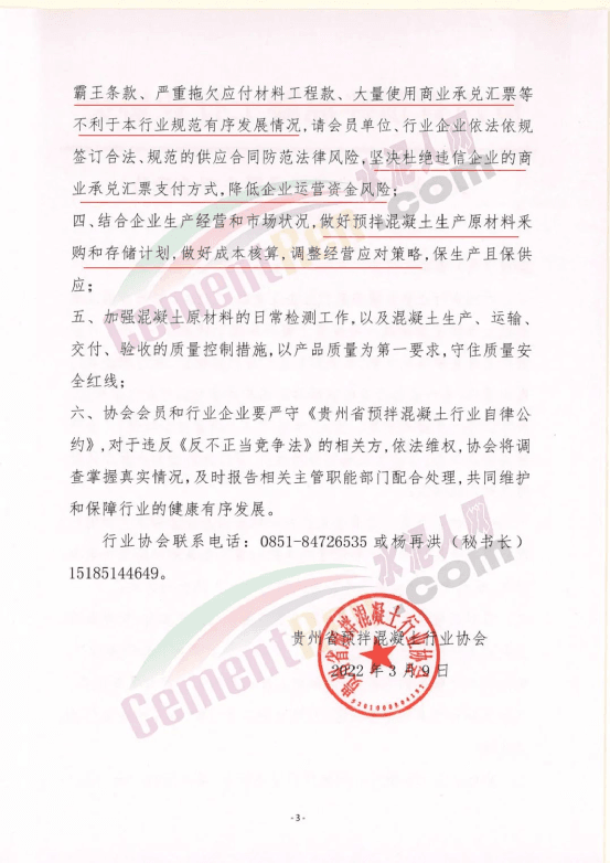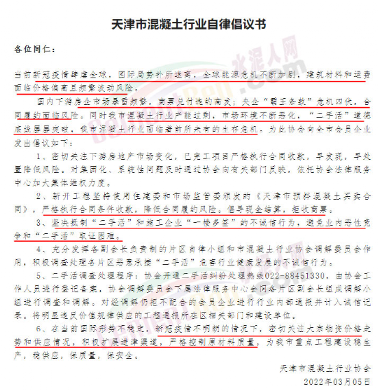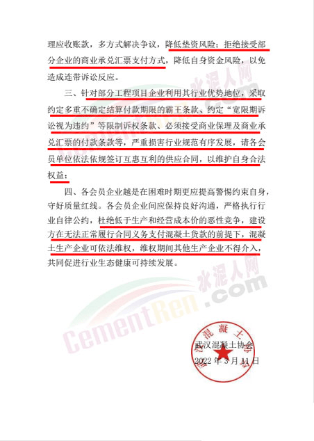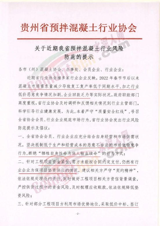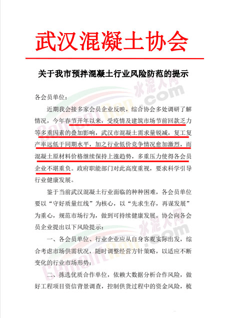 據(jù)水泥人網(wǎng)了解,此前武漢市混凝土協(xié)會、貴州省預(yù)拌混凝土協(xié)會、西安市建筑節(jié)能協(xié)會等多個機(jī)構(gòu)都曾發(fā)布類似的風(fēng)險提示和倡議文件。也多有提到基建施工開工率不足,市場競爭激烈,拒收風(fēng)險商票等內(nèi)容。