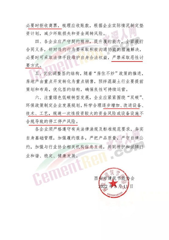西安市建筑節(jié)能協(xié)會發(fā)通知給預(yù)拌混凝土行業(yè)企業(yè)稱,近期西安市混凝土行業(yè)面臨商業(yè)承兌匯票兌付風(fēng)險、融資環(huán)境緊縮、原材料價格上漲等因素造成的資金壓力增大,加之受本輪疫情的沖擊,導(dǎo)致市場需求受阻。協(xié)會要求混凝土企業(yè)間加強(qiáng)信息互通,供需雙方或各企業(yè)之間發(fā)生糾紛時,其他同行企業(yè)嚴(yán)禁直接介入,應(yīng)當(dāng)尊重合同約定,避免破壞已有的合同關(guān)系,侵害同行的合法權(quán)益;在原材料有效供給不足的情況下,更要嚴(yán)把原材料質(zhì)量關(guān),堅決抵制惡意低價競爭行為,杜絕以犧牲質(zhì)量換取利潤空間。