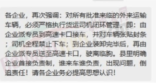 臨朐企業(yè)收到通知強(qiáng)調(diào),對(duì)所有批準(zhǔn)來臨的外來運(yùn)輸車輛,必須嚴(yán)格執(zhí)行貨運(yùn)司機(jī)閉環(huán)管理,即:由企業(yè)派專員到高速卡口接車,并對(duì)車輛張貼封條;司機(jī)全程禁止下車;到企業(yè)裝卸完畢后,再由企業(yè)派專員送至高速卡口,駛離臨朐。縣里明確企業(yè)首接負(fù)責(zé)制,誰來車誰負(fù)責(zé),出現(xiàn)問題,倒追責(zé)任!