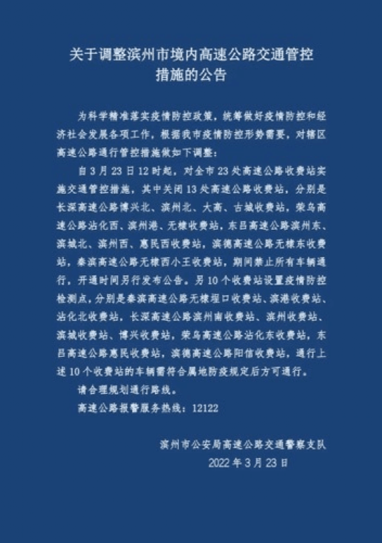 濱州市公安局高速交警支隊(duì)通知,自3月23日12時(shí)起,對(duì)全市23處高速公路收費(fèi)站實(shí)施交通管控措施,其中關(guān)閉13 處高速公路收費(fèi)站,開通時(shí)間另行發(fā)布公告。另10個(gè)收費(fèi)站設(shè)置疫情防控檢測(cè)點(diǎn),車輛需符合屬地防疫規(guī)定后方可通行。