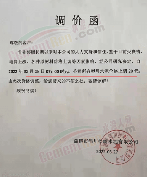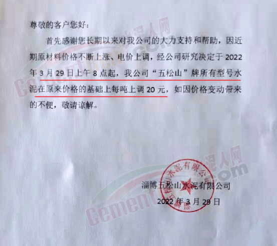 淄博市淄川松嶺水泥有限公司通知,鑒于目前受疫情、電費(fèi)上漲,各種原材料價(jià)格上調(diào)等因素影響,經(jīng)公司研究決定,自3月28日7時(shí)起,公司所有型號(hào)水泥價(jià)格上調(diào)20元/噸。