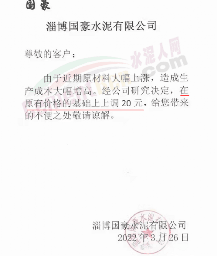 淄博國(guó)豪水泥有限公司通知,由于近期原材料大幅上漲,造成生產(chǎn)成本大幅增高,經(jīng)公司研究決定,在原有價(jià)格基礎(chǔ)上上調(diào)20元/噸。