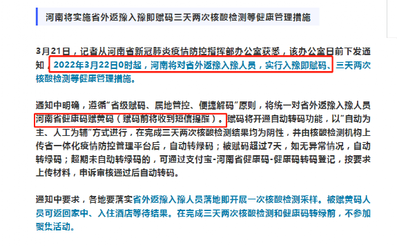 據(jù)了解,河南省新冠肺炎疫情防控指揮部辦公室近期曾下發(fā)通知,自3月22日0時(shí)起對(duì)省外返豫入豫人員,實(shí)行入豫即賦黃碼,三天兩檢等健康管理措施。