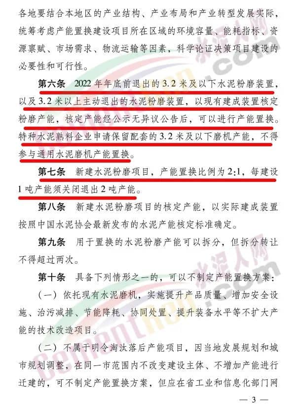 2022年底前退出的3.2米及以下水泥粉磨裝置,以及3.2米以上主動退出的水泥粉磨裝置,以現(xiàn)有建成裝置核定粉磨產(chǎn)能,核定產(chǎn)能經(jīng)公示無異議公告后,可以進行產(chǎn)能置換。