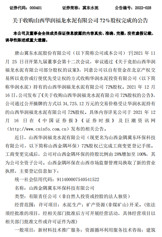 日前,冀東水泥發(fā)布公告稱,公司于2021年11月25日召開第九屆董事會(huì)第十二次會(huì)議,審議通過《關(guān)于競(jìng)拍山西華潤福龍水泥有限公司部分股權(quán)的議案》,同意公司以自有資金在北京產(chǎn)權(quán)交易所以競(jìng)價(jià)或行使優(yōu)先受讓權(quán)的方式收購華潤水泥投資有限公司(以下簡稱華潤水泥)持有的山西華潤福龍水泥有限公司72%股權(quán)。2021年12月16日,公司發(fā)布了《關(guān)于收購山西華潤福龍水泥有限公司72%股權(quán)的公告》,公司通過公開摘牌的方式以34,725.12萬元的交易價(jià)格受讓華潤水泥持有的山西華潤福龍水泥有限公司72%股權(quán)。