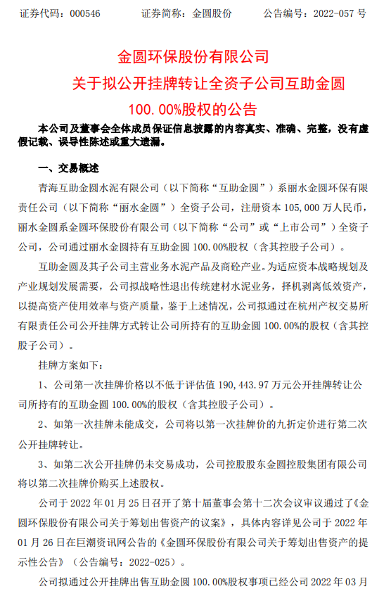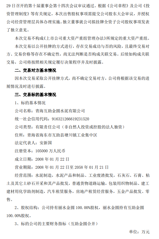 互助金圓及其子公司主營(yíng)業(yè)務(wù)水泥產(chǎn)品及商砼產(chǎn)業(yè)。為適應(yīng)資本戰(zhàn)略規(guī)劃及產(chǎn)業(yè)規(guī)劃發(fā)展需要,公司擬戰(zhàn)略性退出傳統(tǒng)建材水泥業(yè)務(wù),擇機(jī)剝離低效資產(chǎn),以提高資產(chǎn)使用效率與資產(chǎn)質(zhì)量,鑒于上述情況,公司擬通過(guò)在杭州產(chǎn)權(quán)交易所有限責(zé)任公司公開(kāi)掛牌方式轉(zhuǎn)讓公司所持有的互助金圓100%的股權(quán)(含其控股子公司)。