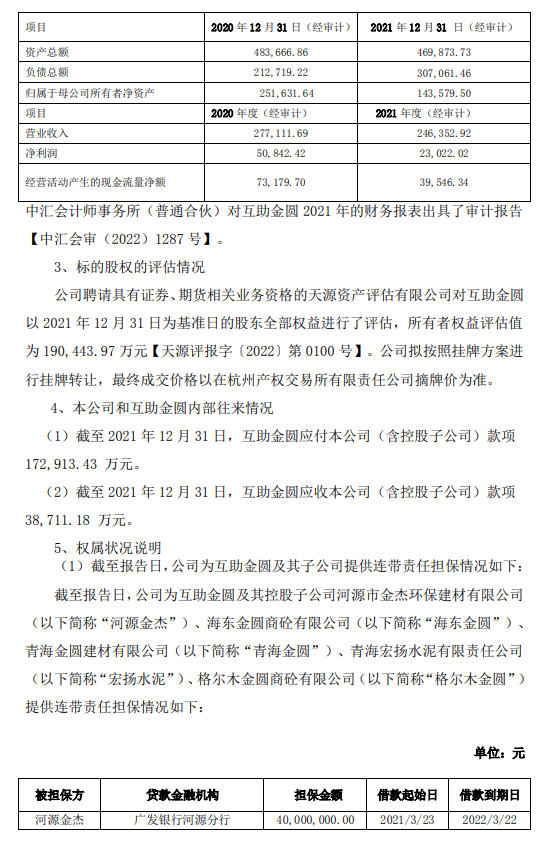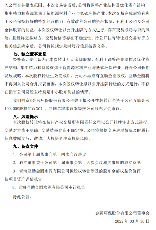 3月29日金圓股份公布,青?;ブ饒A水泥有限公司(“互助金圓”)系麗水金圓環(huán)保有限責(zé)任公司(“麗水金圓”)全資子公司,注冊(cè)資本10.5億人民幣,麗水金圓系公司全資子公司,公司通過(guò)麗水金圓持有互助金圓100%股權(quán)(含其控股子公司)。