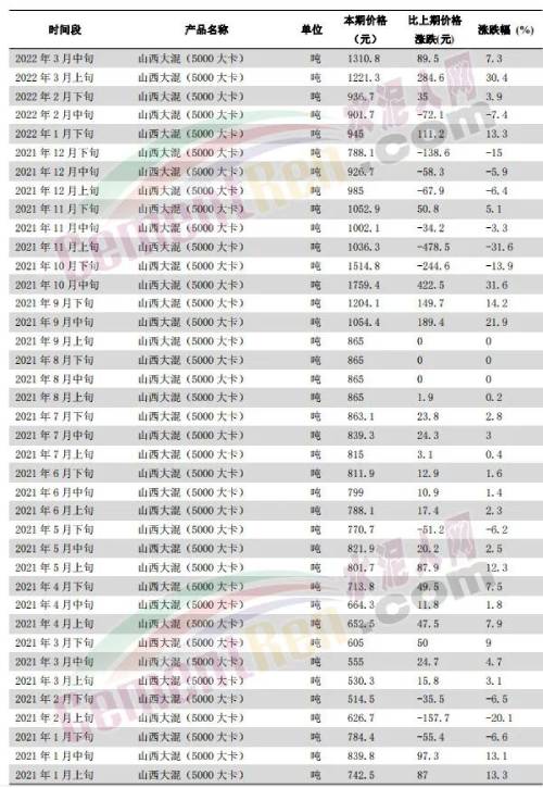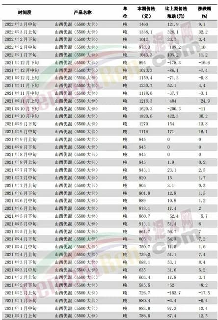 據(jù)水泥人網(wǎng)了解,煤價每變動100元,對水泥成本影響大約在10-15元/噸。以水泥企業(yè)燒成系統(tǒng)常用5000-5500大卡混煤為例,國家統(tǒng)計局數(shù)據(jù),流通領(lǐng)域山西大混(5000大卡)2021年1月上旬為742.5元/噸,今年3月中旬為1310.8元/噸,上漲了568.3元/噸,漲幅約77%;山西優(yōu)混(5500大卡)2021年1月上旬為786.5元/噸,2022年3月中旬為1460元/噸,上漲了673.5元/噸,漲幅86%。