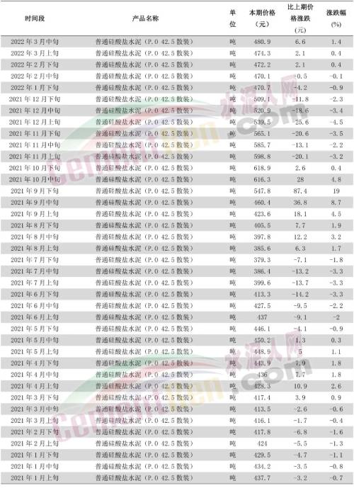 普通硅酸鹽水泥(P.O 42.5散裝)2021年初3月中旬最高價為2021年10月下旬的618.9元/噸,最低價為2021年7月下旬報價為379.3元/噸。高低價之間相差239.6元/噸;3月中旬報價480.9元/噸,位于高、低價之間,與上年同期413.5元/噸相比,高出67.4元/噸。