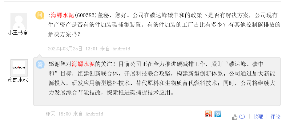 海螺水泥表示,目前公司正在全力推進碳減排工作,緊盯“碳達峰、碳中和”目標,組建創(chuàng)新聯(lián)合體,開展科技聯(lián)合攻堅,構(gòu)建新型創(chuàng)新體系。公司通過加大新能源投入,研發(fā)應(yīng)用新型燃料技術(shù)、替代原料和生物質(zhì)替代燃料技術(shù);同時,公司將繼續(xù)大力發(fā)展綜合節(jié)能技改,探索推進碳捕捉技術(shù)應(yīng)用。